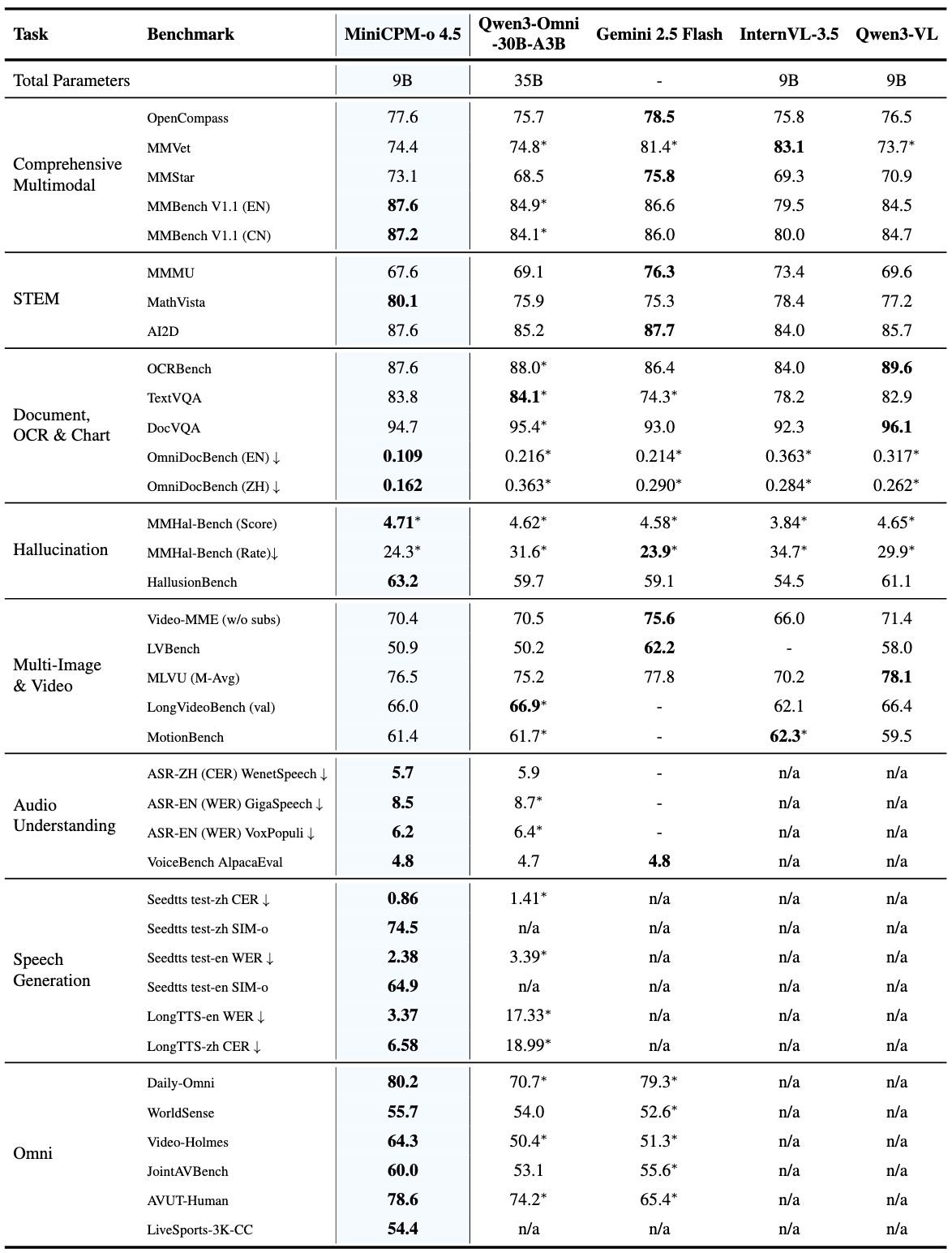 | MiniCPM-o 4.5-Instruct | 0.9 | 2.5 | 5.9 | 5.7 | 1.4 | 2.8 | 8.5 | 6.2 | 49.9 | 26.4 | 76.9 | 60.2 | 4.8 | 75.5 | 70.2 | 59.2 |