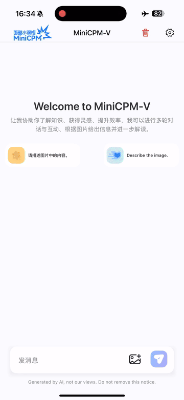 MiniCPM-V 4.0 支持多种推理方式,包括 **llama.cpp、Ollama、vLLM、SGLang、LLaMA-Factory 及本地 Web Demo 等**。我们还开源了可以在 iPhone 和 iPad 运行的 iOS App。欢迎参考我们开源的 **结构清晰的[使用手册](https://github.com/OpenSQZ/MiniCPM-V-CookBook)** 玩转 MiniCPM-V 4.0,其中涵盖了详细的部署指南和真实示例。