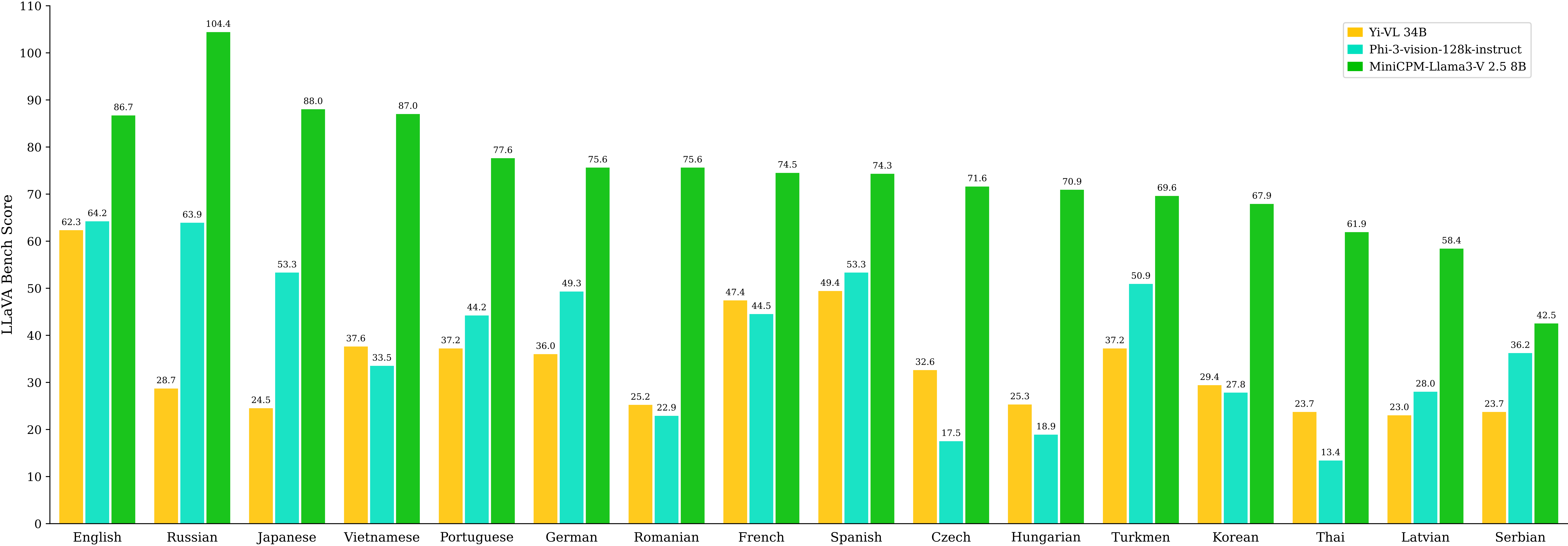 • 🌏 Multilingual Support. Thanks to the strong multilingual capabilities of Llama 3 and the cross-lingual generalization technique from VisCPM, MiniCPM-Llama3-V 2.5 extends its bilingual (Chinese-English) multimodal capabilities to over 30 languages including German, French, Spanish, Italian, Russian etc. We achieve this extension through only 90k translated multimodal data (<0.5% SFT data). All Supported Languages.