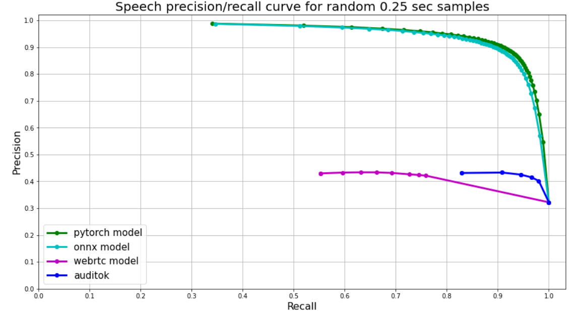 Since our VAD (only VAD, other networks are more flexible) was trained on chunks of the same length, model's output is just one float from 0 to 1 - speech probability. We use speech probabilities as thresholds for precision-recall curve. This can be extended to 100 - 150 ms. Less than 100 - 150 ms cannot be distinguished as speech with confidence.